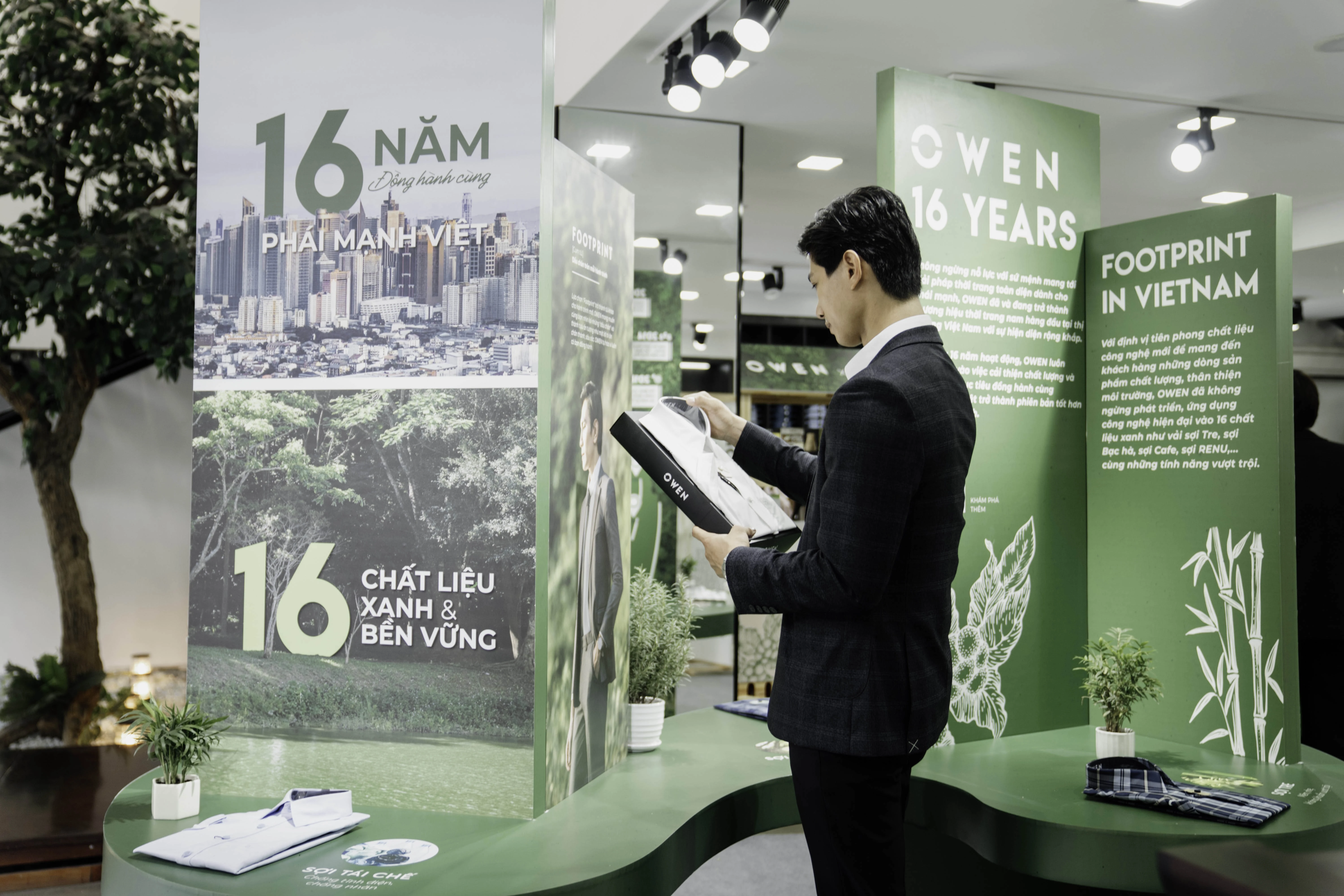 Trong không gian như một triển lãm thu nhỏ, hành trình 16 năm của OWEN được thể hiện sinh động với gam màu xanh – biểu tượng của xu hướng thời trang xanh, bền vững. Được biết, trong suốt 16 năm phát triển, doanh nghiệp đã đưa vào thử nghiệm và sản xuất quần áo từ khoảng 16 nguyên liệu xanh như cà phê, bạc hà, sen…. Tại không gian của workshop, thông tin về những chất liệu vải “xanh” cũng được thể hiện chi tiết, giúp khách hàng có thể trải nghiệm trực quan sự thoải mái, phù hợp khi được ứng dụng trong sản phẩm thời trang của OWEN.
